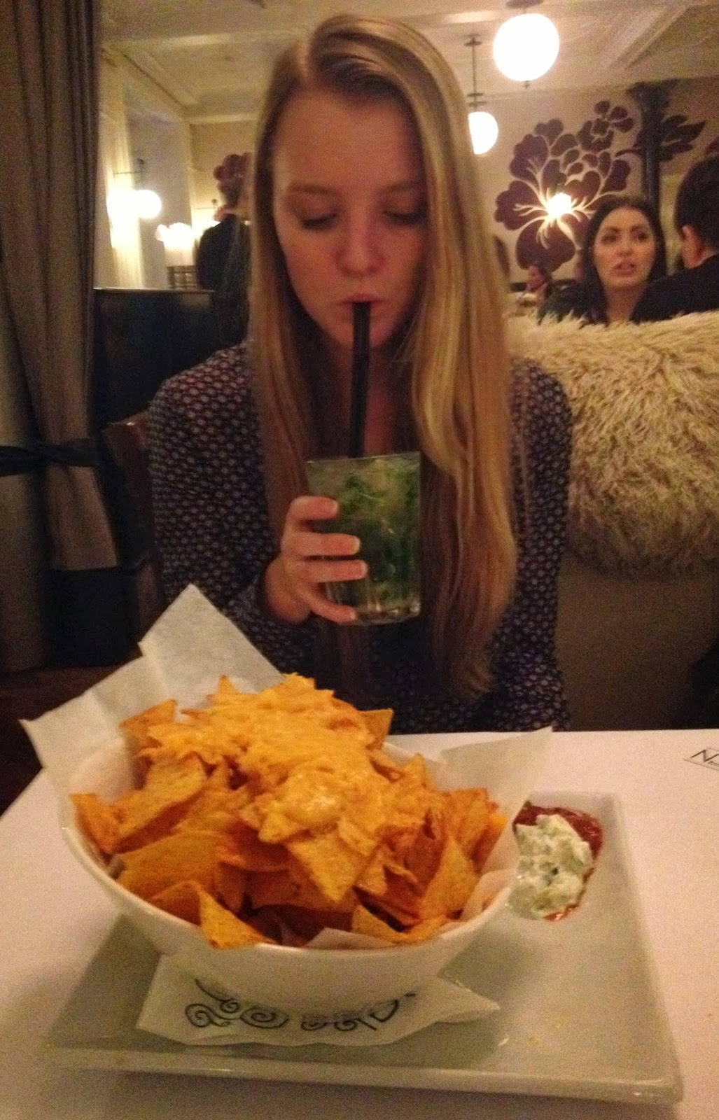 My sister and I went to Copenhagen today to do some shopping and watch a theatre concert called Mozart. It was really weird and good. Here I am eating Nachos and drinking a Mojito Royal at Café Norden.