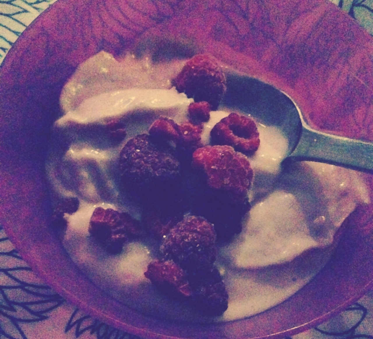Nu ligger jag i min nybäddade säng och väntar på Tom tillsammans med kvarg. Denna gång med jordgubbssmak tillsammans med frysta hallon. HUR gott som helst. Att jag inte äter mer kvarg är tråkigt.