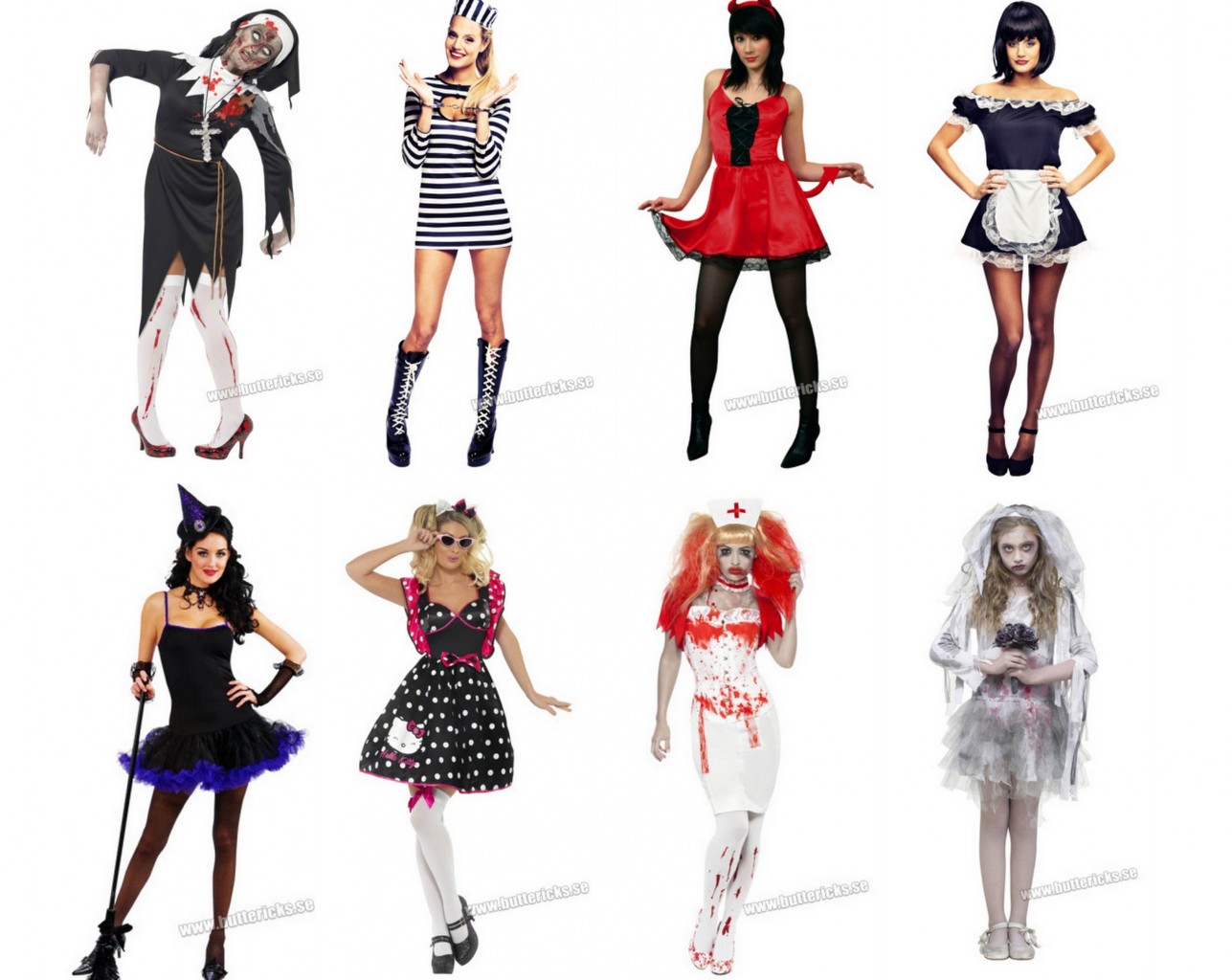 Nästa helg så är planerna, halloweenfest. Vad jag ska klä ut mig till har jag verkligen ingen aning om. Dresscoden är läskigt och det finns ett måste att klä ut sig. Sexigt är inte acceptabelt. Jag har ingen riktig användning av utklädningskläder så jag har ingen jättestor lust att lägga ut massa pengar på en grym utklädnad heller. Dessa åtta ovanför är något helt ok. Vad tycker ni? Vissa av dom kan vara lite sexiga men jag ska vara sminkad något zombieliknande så super sexigt blir det hur som helst inte. Hjälp please.
