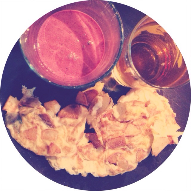 Allt detta var min frukost. Jag älskar verkligen helger för då hinner man verkligen tänka lite extra på vad man stoppar i magen. Idag blev det potatisomelett, smoothie och juice. Det var riktigt gott – trots den fula bilden.