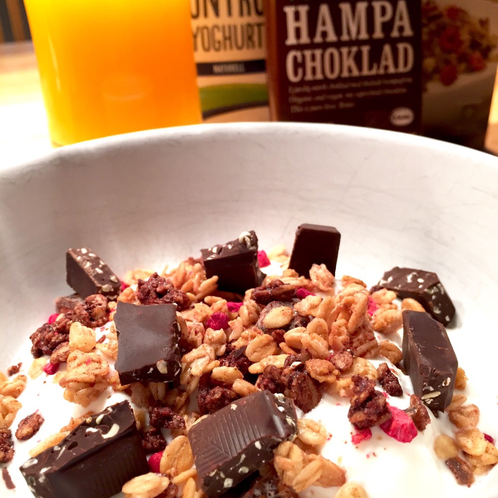 Just nu sitter och äter en riktig god frukost. Protein control yoghurt, granola med kakao och hallon, några bitar hampa choklad i yoghurten och ett glas färskpressad apelsinjuice för att boosta kroppen med liten C-vitamin såhär när skolan börjar igen. Tänker INTE bli sjuk.