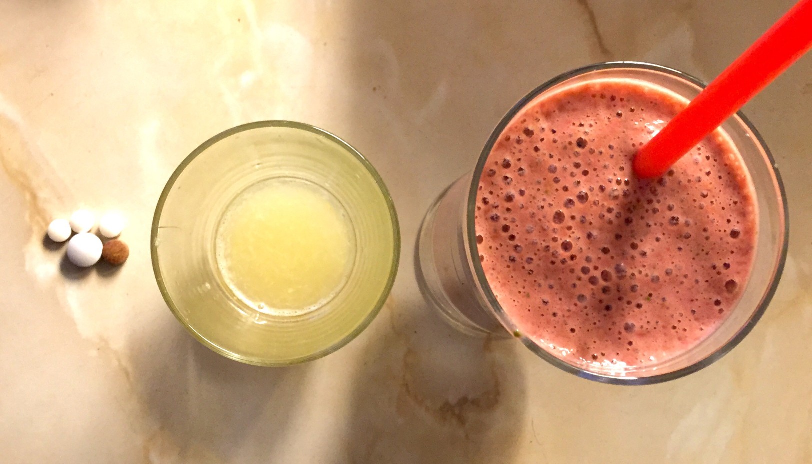 Såhär såg min frukost ut i morse! Smoothie gjord på frysta hallon, naturell lättyoghurt, en skvätt mjölk, ett helt rått ägg, juice från en pressad apelsin, en näve färsk bladspenat, lite hampaprotein, spirulina, vetegräs, acai plus en skvätt vaniljsocker för att jämna ut den fruktansvärda smaken man får av Reneé Voltaires smoothie mix. Men den blev riktigt god faktiskt! Sen drack jag även juice från en pressad citron för att chocka kroppen lite. Tabletterna är Esbiritox, vitaminer och rosenrot.