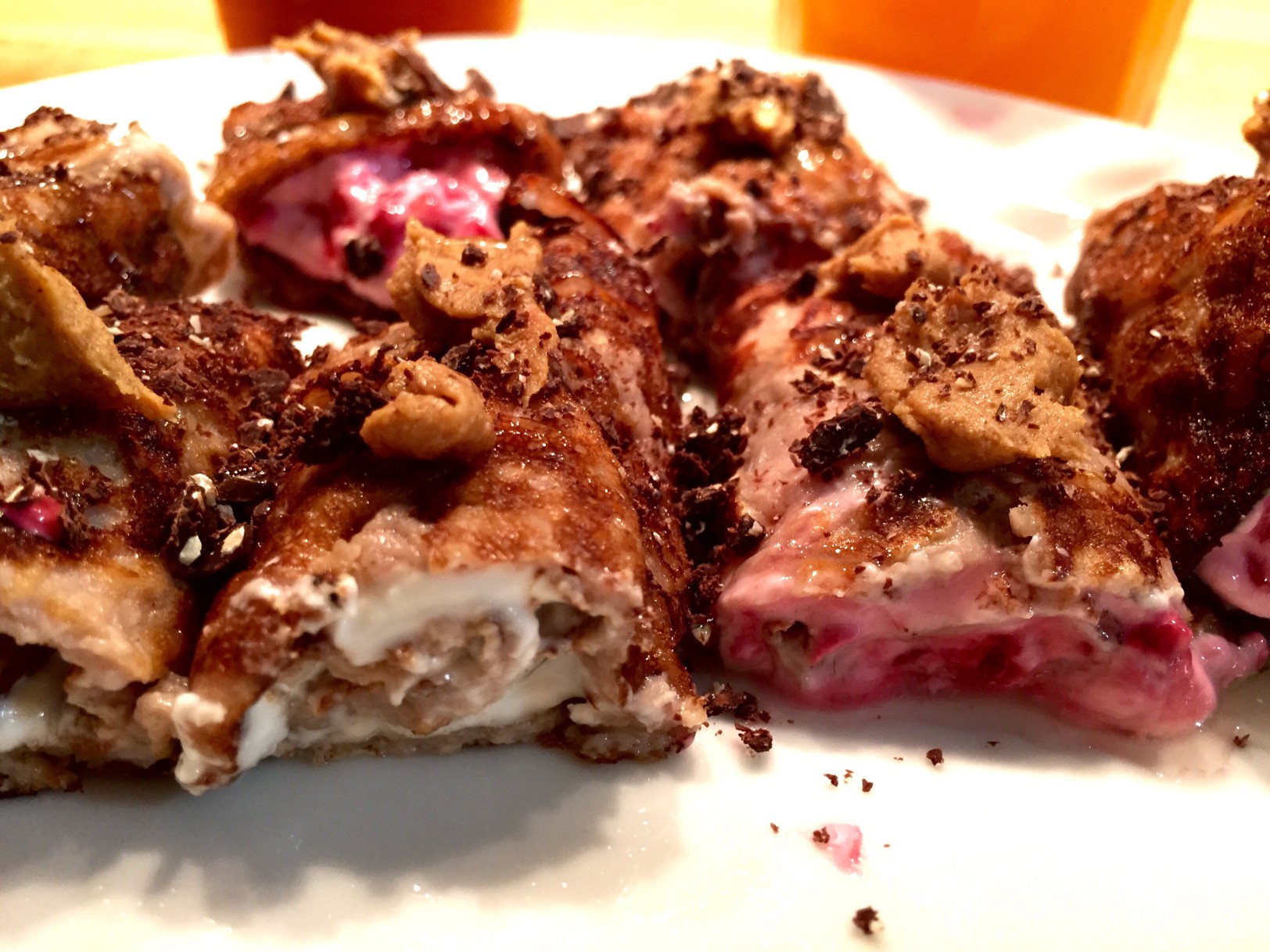 Varken snygg uppläggning eller snygga pannkakor men en gudomligt bra kombo (!!!) och detta blev min frukost idag. Jag gjorde proteinpannkakor på ett helt ägg, en äggvita, en halv skopa one whey choklad hasselnöt, en halvskopa onecasein double chocolate, två dl mjölk och en tsk fiberhusk. Jag fyllde pannkakorna med en vaniljkräm (lättkvarg, vaniljsocker och stevia) och en hallonkräm sedan toppade jag med en klick jordnötssmör, lite riven hampachoklad och en skvätt agave! Hur gott som helst! 😀 Drack ett glas nyponsoppa (utan socker) och ett glas juice till.