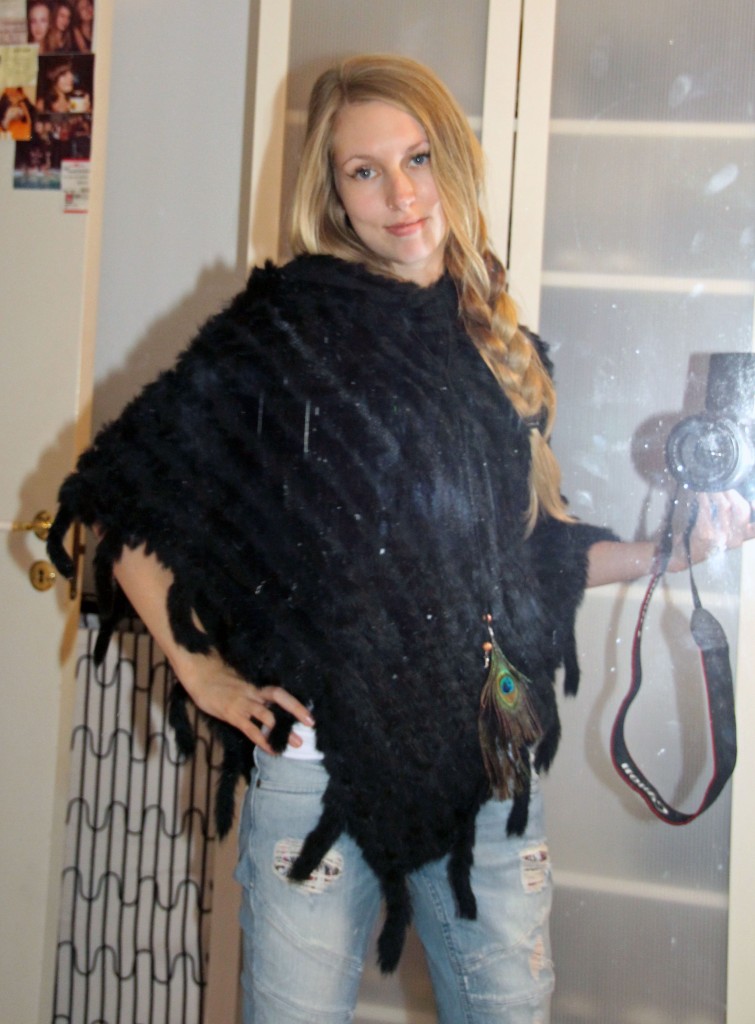 Sen även en poncho från Raglady 🙂 med luva på 🙂 super mys! Ursäktar att mitt hår ser så risigt ut.. men har glömt min plattång hos Viktor :S så de får bli fläta.. och så lite regna och blåst på de! :/