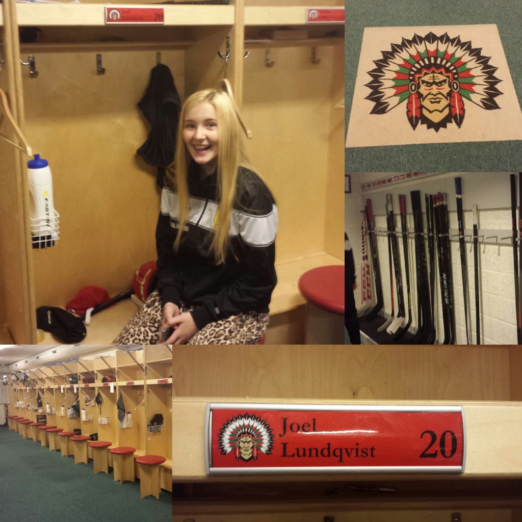Sitter just nu inne på Frölundaborg Campus. Alltså Frölunda hockey lags egna tv rum? eller loge, eller vad det heter 😛 i alla fall, där de byter om, äter, kollar tv, duschar, gymmar.. ah.. allt 🙂 Vi kollar Sverige-Ryssland Hockey 🙂 och självklart får vi en rund tur på stället! 😀
