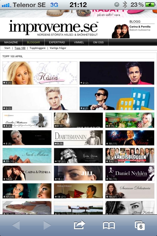 Världens bästa nyhet! 13 apr 2012 av Jill Nämen vad glad jag blev när jag gick in på topp 100 blogglistan på Improveme och hittade mig själv på 15e plats. Det är tack vare er goingar som så flitigt läser och delar min blogg. Har tydligen petat ned Daniel Nyhlén! Stort för mig:)