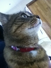 Tyvärr tar hon in mycket fåglar och möss. Men hon är också charmig och kan ha de sötaste ögonen när hon vill. Speciellt när hon skall gosa och trampa på mig.