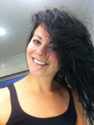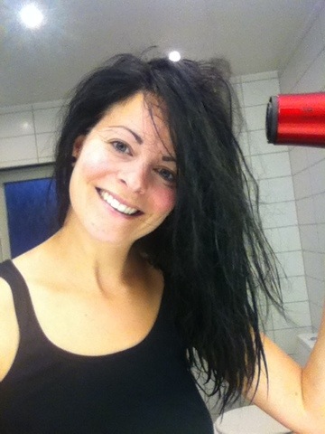 Hemma efter träningen 10 maj 2012 av Jill Nyduschad och blåser håret. Dagens resultat på löpbandet kommer strax. Idag hade jag dessutom sällskap av Camilla Berlin.