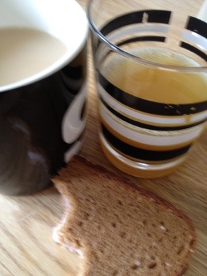 Lingongrova, mjölkfritt smör, kalkonpastrami, te med havremjölk och juice.