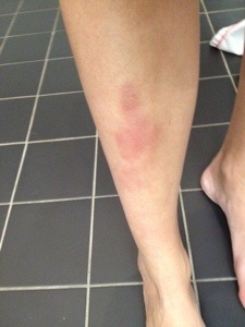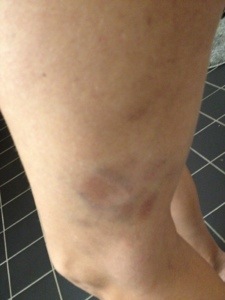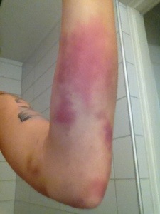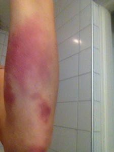 Här gör det faktiskt ont. På de andra ställena känns det ju inte. Ondast gör det ovanför blåmärket där det oxå är helt hårt.