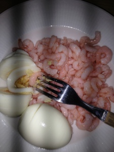 Sitter i sängen och äter kvällsmat. Räkor och ägg.