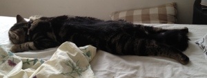 En av våra katter, Svennis. Han är en kattunge men han är sjukt lång. Han ligger alltid så konstigt med benen. Jag skall egentligen inte uttala mig om det som sover med en kudde mellan knäna för att höfterna inte skall säcka ihop och värka. Skulle vart hos kiropraktorn idag men det blev flyttat till nästa vecka. Inte ok. Vaknade igår natt av att jag grät för det gjorde så ont i dem.