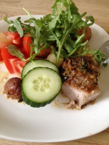 Hade fixat middag innan jag gick hemifrån. Det är det bästa. Jag är ju alltid sjukt hungrig när jag kommer hem. Idag blev det fläskfilé dränkt i vitlök, ugnsbakade potatis och lite sallad. Så gott att jag tror någon annan lagat maten.