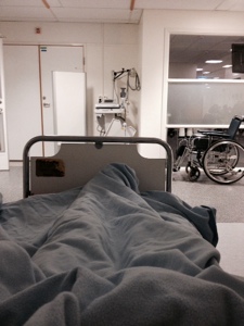 16:56 anmäler jag mig i receptionen på akuten. Svim och kräkfärdig kommer jag in rätt fort till ett undersökningsrum.