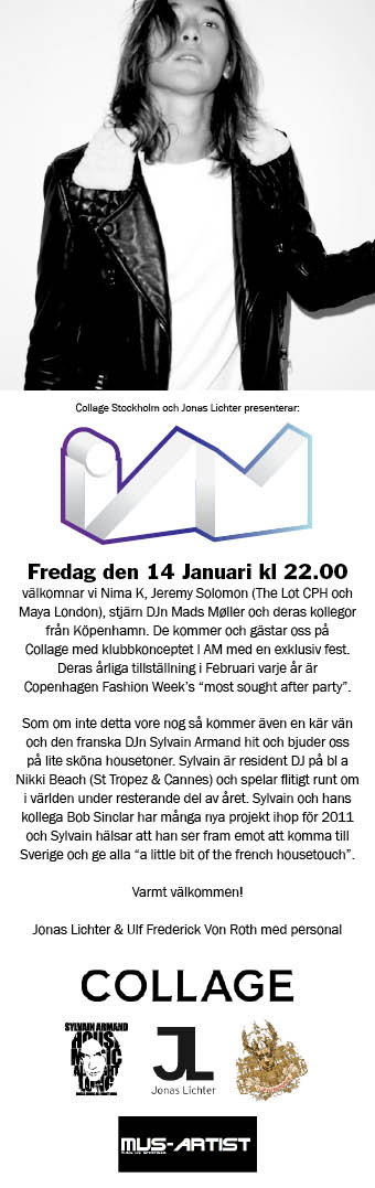 På fredag har jag och Uffe en liten fest på Collage där vi har bjudit in en massa skönt folk från Köpenhamn som kommer hit med ett klubbkoncept som heter I AM samt att Sylvain Armand ska gästspela med Mads från Kph. Kommer bli en rolig kväll….