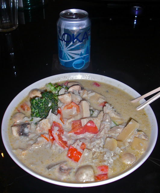 om hem från gymmet för ett tag sen och har lagat lite gröncurrysoppa med kyckling, ris och grönsaker.
