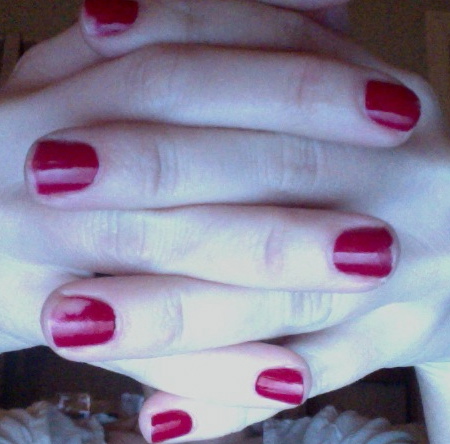 Idag hade vi manikyr på schemat och Bella gjorde fina, röda naglar på mig. Tyvärr lyckas jag ALLTID förstöra lackningen när jag utför manikyr på kund. 🙁 Fick beröm idag när jag lackade ”fransk”. Har väldigt höga krav på mig själv, så roligt när det går bra!