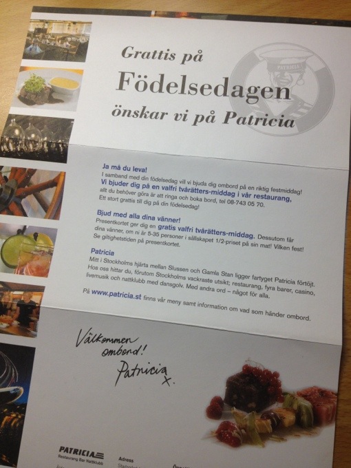 Nä, jag fyller inte år än (3 v kvar), men igår fick jag en tidig födelsedagspresent 🙂 Fick detta erbjudande förra året oxå, så trodde det var pga att jag fyllde 30. Men att fylla 31 är kanske lika bra?! Gratis 2-rätters middag känns ju generöst… Man tackar!