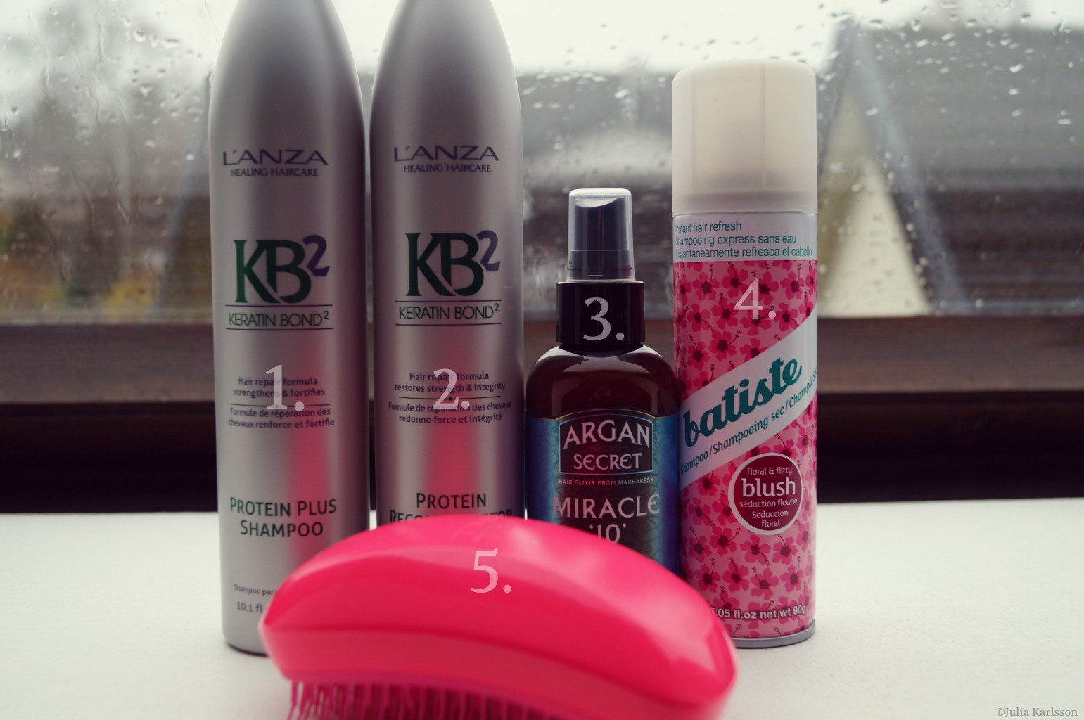 HÅRVÅRD + 1 nov 2013 av juliaamanda 1. L’Anza Protein Plus Shampoo 2. L’Anza Protein Reconstructor 3. Argan Secret Miracle ’10’ 4. Batiste Dry Shampoo- Blush 5. Tangle Teezer