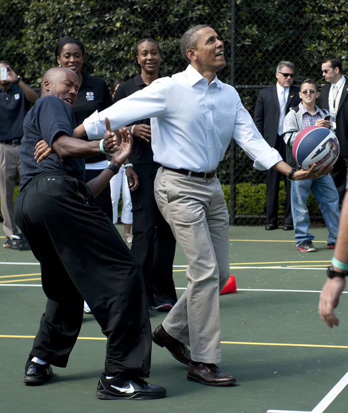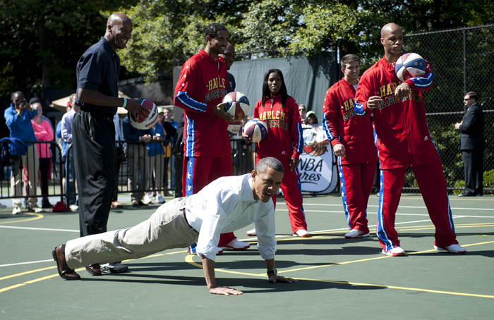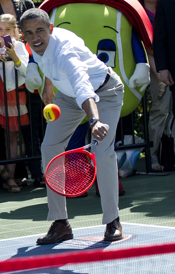 I Vita Husets årliga äggletarjakt passade Barack Obama på att spela lite basket, tennis och visa upp sina starka armar i några armhävningar medan publik fick se spektaklet.