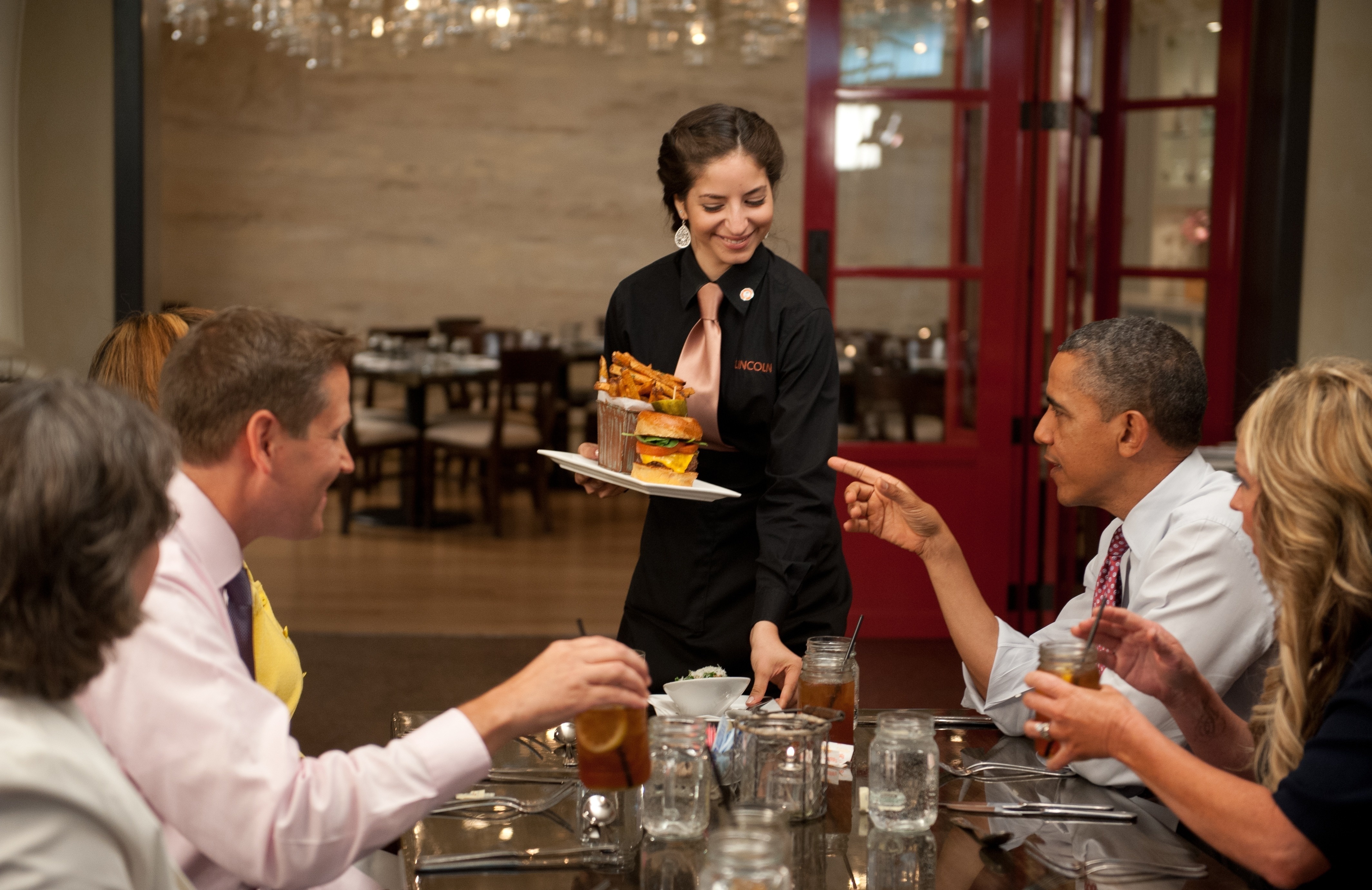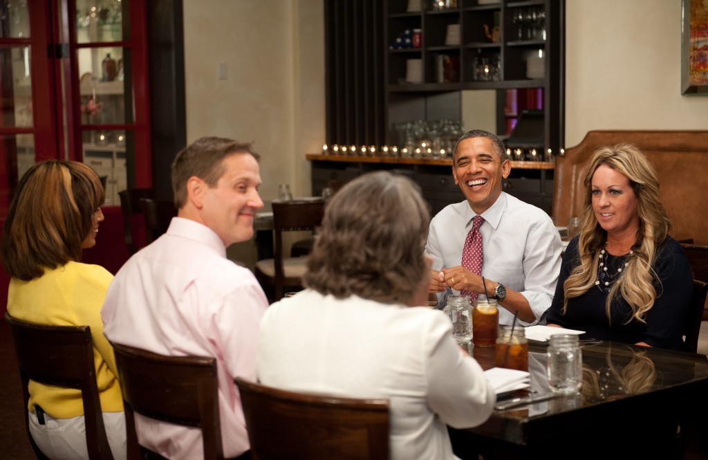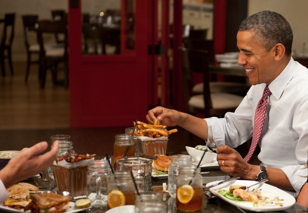 Här på Kennedy’s BBQ Smokehouse pratade han med fyra vinnare av kampanjen ”Lunch with Barack”, ett projekt för att samla in pengar till donation.