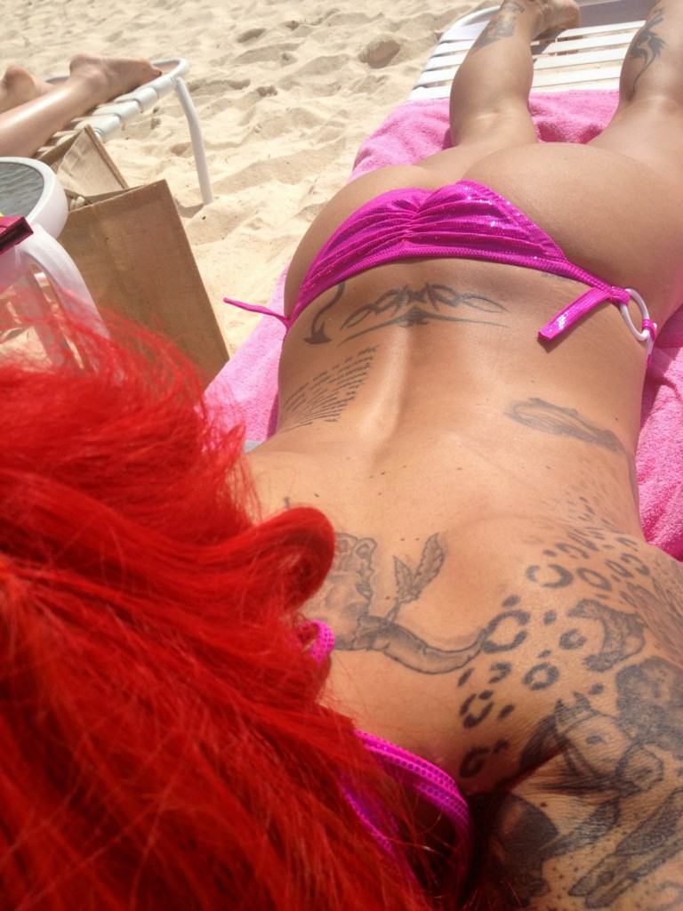 Tatuerat på stranden 27 juli, 2012 av kandisbloggen Glamourmodellen Jodie Marsh tar det piano på stranden och njuter av solen. När hon ändå ligger där i bikini passar hon på att dela med sig av sin kropp till Twitter-världen… Vältatuerad och solbränd!