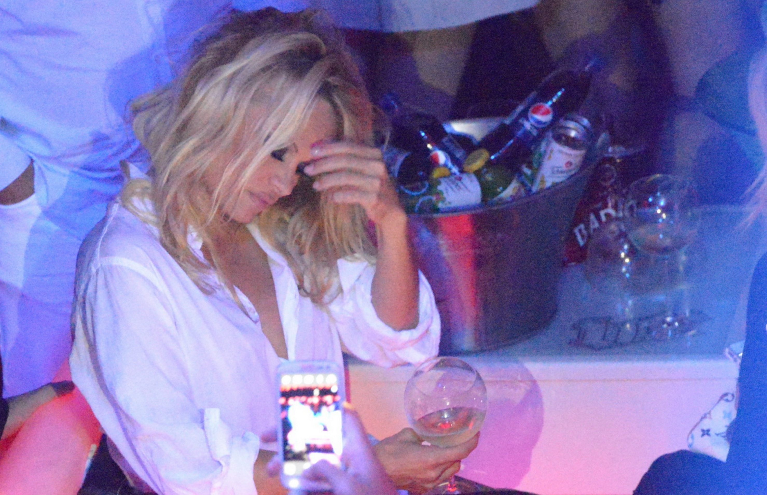 Många kändisar verkar hänga i paradiset St Tropez, och ”Baywatch”-aktrisen Pamela Anderson är en av dem. Här syns hon på en VIP-avdelning med alkohol, alkohol och åter alkohol runt omkring sig.