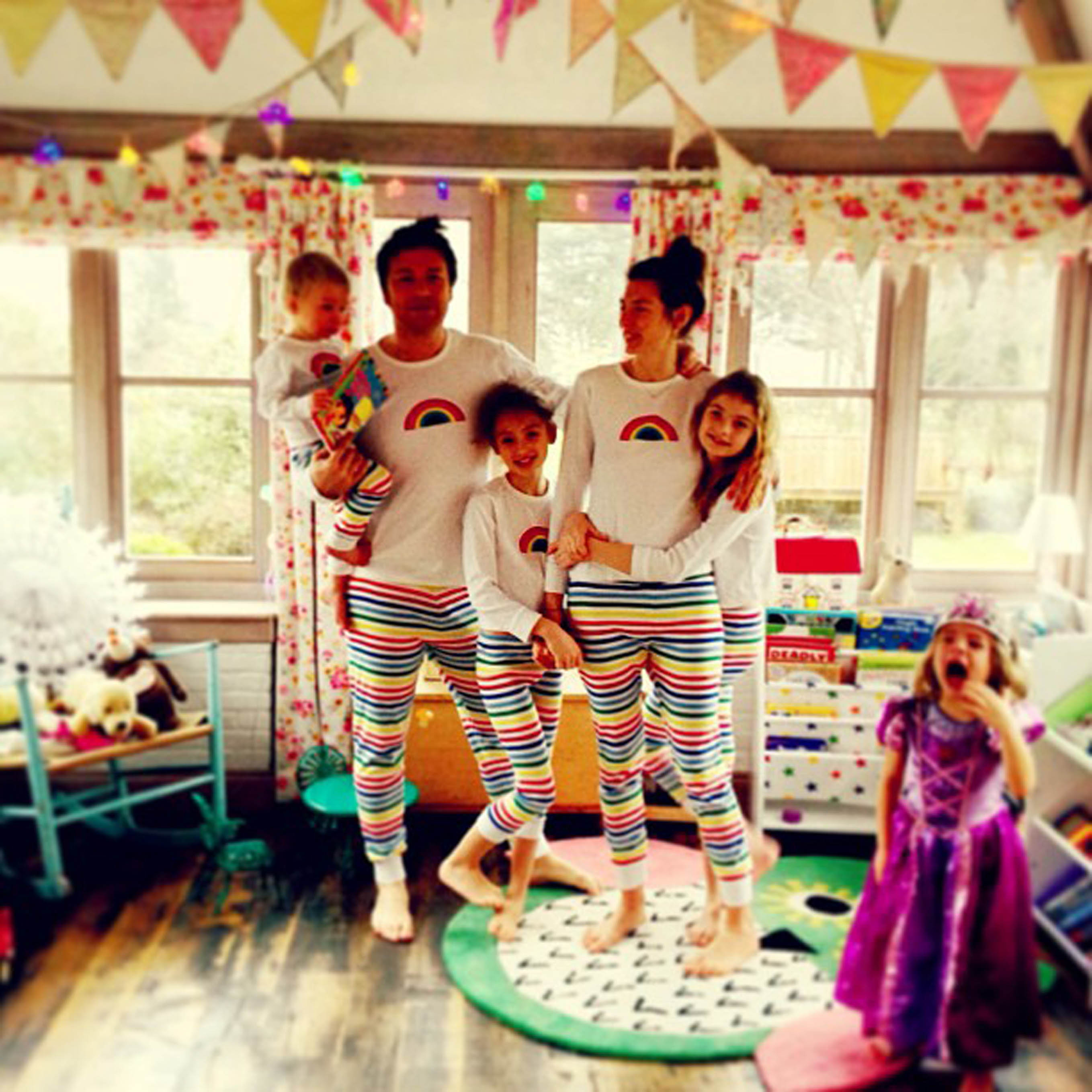 ”Haha the whole family in Jools PJs …I cant believe Mother Care actually mad me a pair of her toddler Jim-Jams !! Very funny if not slightly strange. Although one little purple princes had hers in the wash & wasnt very happy bless her …….big love to all you guys #jamie x x. X x”, skrev han tillsammans med bilden.