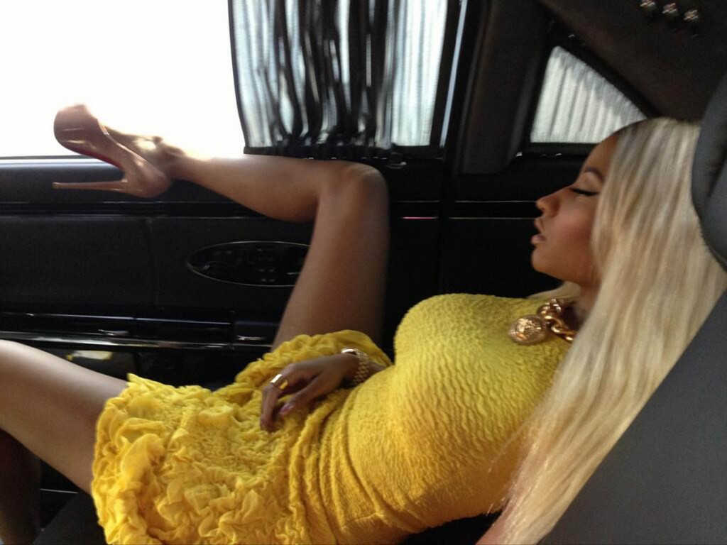En diva på vift 22 mars, 2013 av kandisbloggen Nicki Minaj slappar i bilen. Stjärnan har redan tjuvstartat påskfirandet med en kycklinggul klänning. Och höööga klackar!