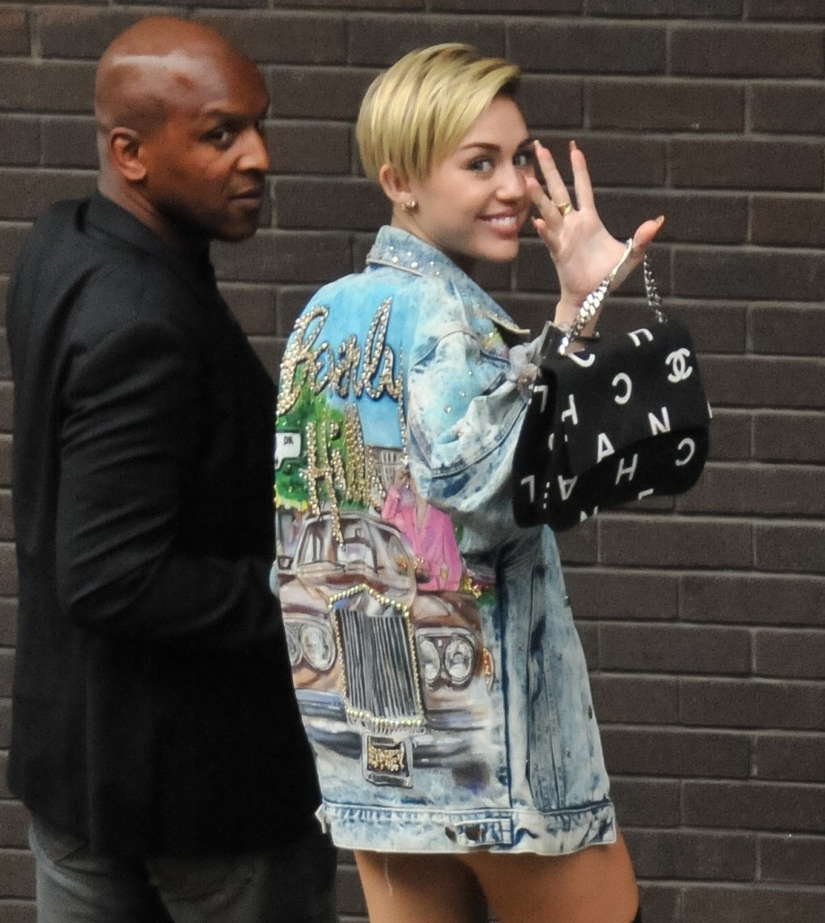 När vi ändå är inne på speciella kläder… Visst är Miley Cyrus pimpade jeansjacka som hon bar igår riktigt häftig? Hon befann sig, liksom Rihanna, i London under gårdagen.