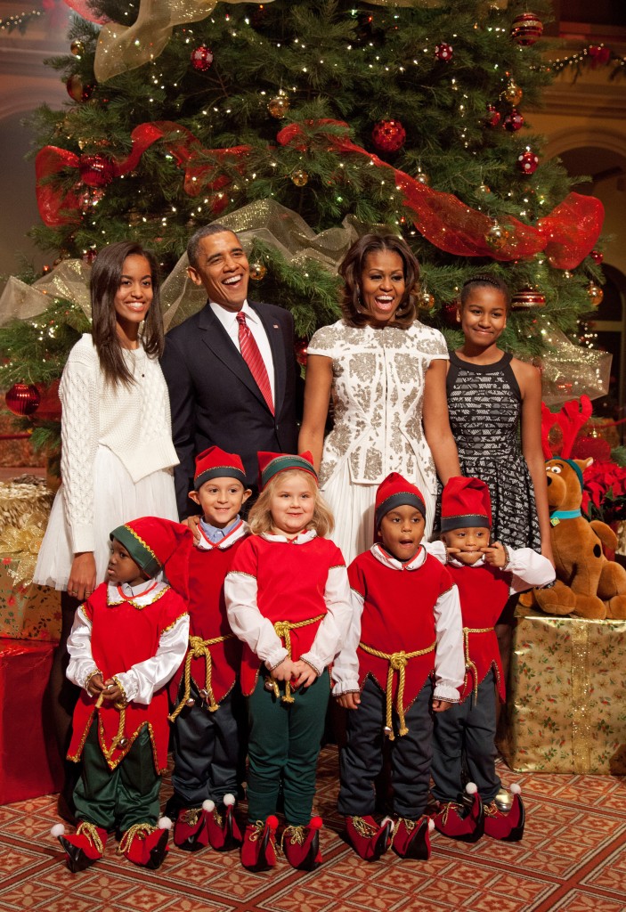Hela familjen Obama ser lyckliga och julglada ut. Även ett gäng tomtenissar har fått äran att vara med på bild.