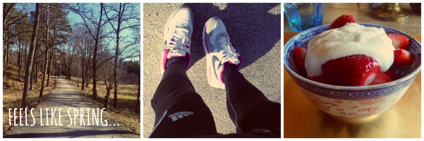 Blev att springa en runda i solen, jag brukar inte springa så ofta men ibland händer det..jag är mer av power-walk typen haha! Belönade mig själv med jordgubbar med kesella!