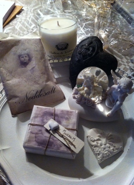 Delar utav innehållet. Ett doftljus som man också kan använda som massageolja, jättefint salt med nötter i, stenhjärta, ängeltvål, dofthjärta och en sån där sak man vänder upp och ner på så snöar det…kommer inte ihåg vad de kallas!