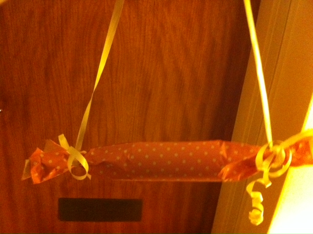 Som sagt önskade pappa sig en stor rymlig vattenflaska med hål i för att hänga nyckel osv där. Sagt och gjort. Vi köpte en. Men det han inte vet är att vi även köpte en liten barn-vattenflaska också. I rosa, självklart. Då tänkte ju jag att inslagningen självklart skulle se lika barnslig och flickig ut som flaskan. Sagt och gjort!