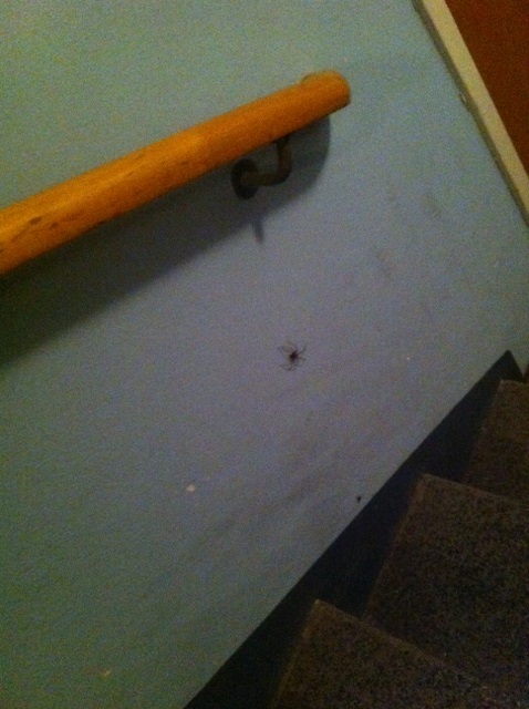 Jag hatar att jag är en sån pussy som inte vågade gå närmare för att verkligen fånga storleken (ÄNDÅ 2 trappsteg ifrån!! imponerad!) men jag tror att ni ser ändå att den är STOR även om bilden är jäkligt missvisande.. Om ni tänker er att den lilla svarta pricken under är storleken på en ”vanlig” större kloakspindel som brukar dyka upp i hemmen ibland – så förstår ni i alla fall storleken lite.