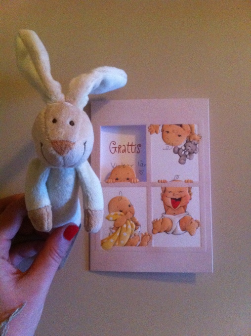 Jag är i vilket fall hemma och redo för honom nu! Vi var iväg och köpte ett litet gosedjur som är lätt för honom att greppa samt ”skramlar” lite smått när man skakar den och ett fint litet kort till det. Något lite mer ordentligt får dem senare!