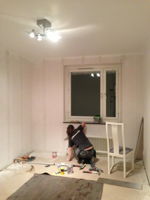 Igår slipade jag alla skarvar i sovrummet och Alex måla första strykningen 😉 vi kanske flyttar in i sovrummet idag? 😀