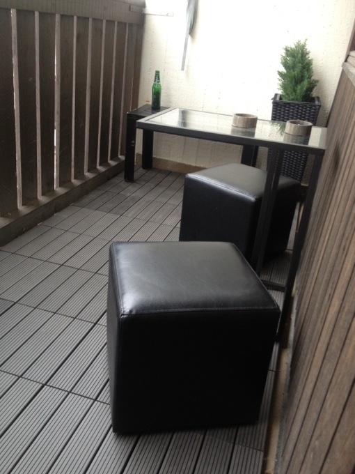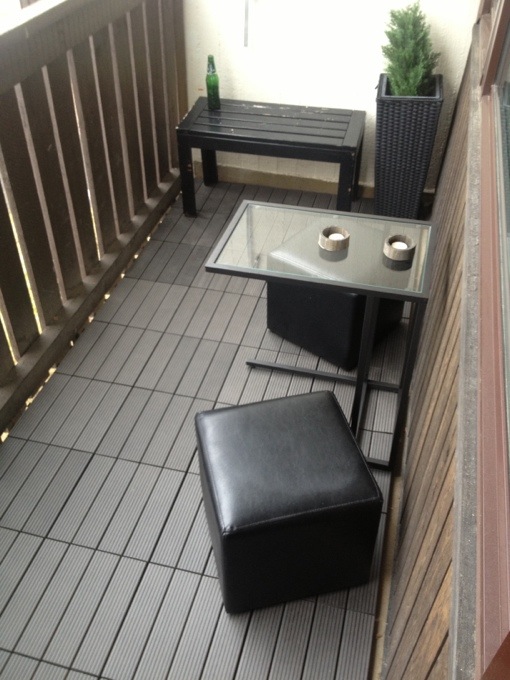 Balkongen är ganska smal, vi hitta ett perfekt bord på Ikea och pallarna hade vi sen innan 🙂 glömde tyvärr ta en före bild, men balkongen var helt tom och hade betong golv!