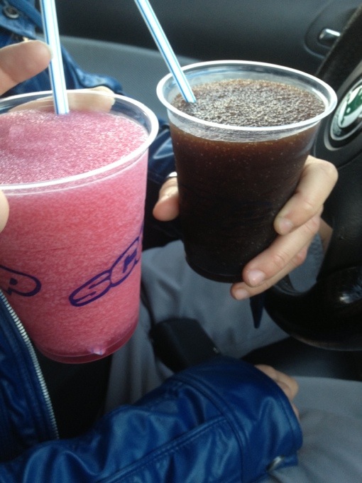 Så vi lyxa till det lite men pizza till middag tihi! Sen blev vi så klart sugna på något annat så vi åkte å köpte slush Mums:) Alex tog cola smak å jag hallon <3