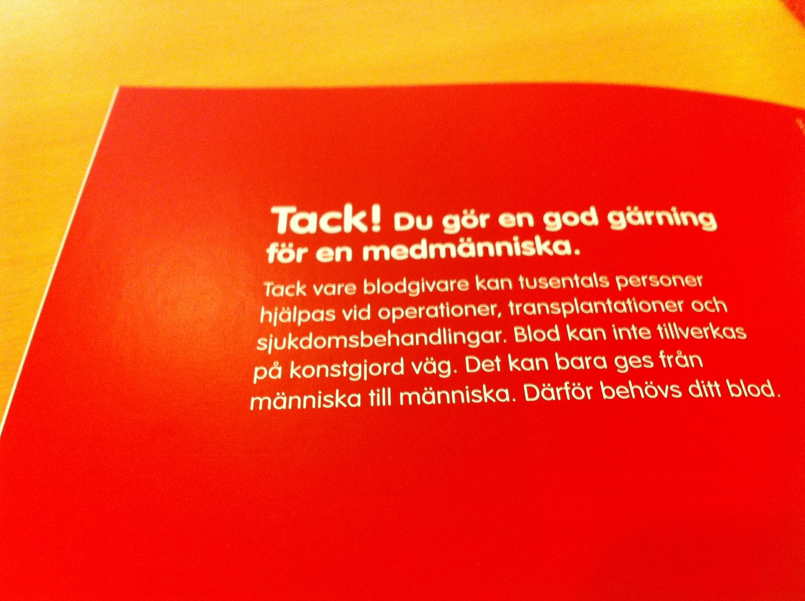 Var på sjukhuset för en stund sen då jag vill bli blodgivare, och det ska jag bli! Idag tog de blodprov som ska undersökas, kollade blodtrycket och blodvärden. Sen fick jag svara på lite frågor och det ser ljust ut för min del, om en månad har jag min första blodgivning! 😀 Hon som kollade blodtrycket sa att jag hade väldigt lågt blodtryck och frågade om jag brukar bli snurrig när jag reser mig. Händer väl ibland men inte lika ofta som innan, var länge sedan jag svimmade på grund av det i alla fall (som tur är). Annars är det väl bara fördelar med lågt blodtryck va?
