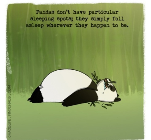 Jag har somnat på massor av lektioner, i en trappa, i min hunds bädd inne, i min hunds bädd ute, på praktiken, på bio osv… Listan kan göras mycket, mycket längre! Jag kan verkligen somna på riktigt udda platser haha så efter att ha läst denna bilden så misstänker jag att jag är en panda!