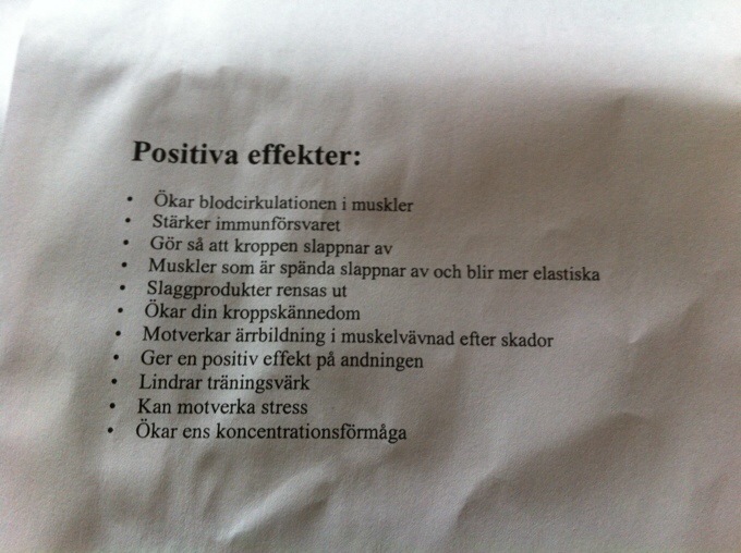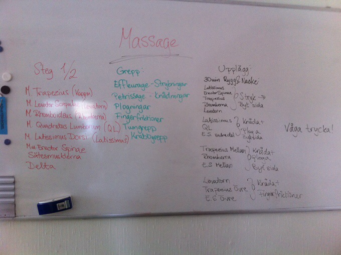 Herregud vad jag har lärt mig mycket idag! Jag kan ge massage så att folk (oftast Simon) tycker det är skönt men det jag kan har jag lärt mig själv eller via youtube-klipp. Det jag lärde mig idag är däremot betydligt mer seriöst haha. Jag har lärt mig namn på muskler, vart de sitter, deras funktioner och hur man masserar dem. Har dessutom lärt mig nya tekniker och blivit mycket bättre! Och på allt detta postiva har jag dessutom fått ca 2 timmar massage då vi ju övar på varandra, riktigt skönt! Ser redan fram emot del 2 på kursen imorgon 😀