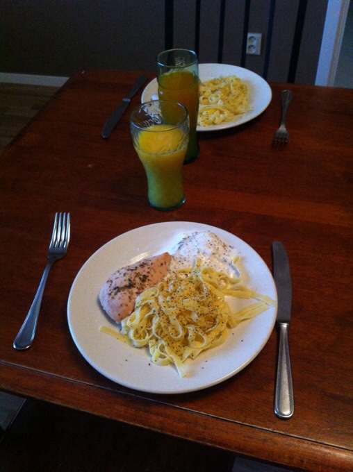 Här är en bild på vår lunch/middag, dagen blir ju lite skruvad när man äter frukost kl 12 haha. Maten var god men ser ganska tråkigt ut utan grönsaker, kyckling och äggpasta är det i alla fall. En ganska värdelös dag idag, känns inte som att jag gjort nånting alls typ. Gått en promenad, handlat två gånger, lagat mat och kollat serier, en riktigt lat dag! Ska faktiskt blir skönt att gå till praktiken imorgon, mycket roligare när man gör nånting. 🙂