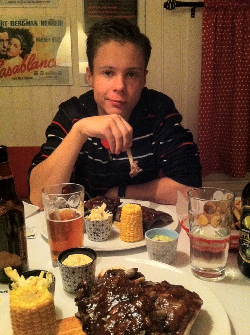 Igår kväll gick vi och åt middag på Suzie Q’s, en restaurang med 50-tals tema och sjuuukt god mat + trevligt sällskap 😉 När vi kom hem fick vänta någon timme innan vi ens kunde smaka på tårtan haha, men Simon och hans kompisar verkade gilla den. 😀 Resten av kvällen kollade vi film och jag gav Simon en 45 minuters helkroppsmassage, sedan somnade vi och har nu sovit sista natten tillsammans på ett tag :/ Men denna gång är det i alla fall bara två veckor till nästa gång! ♥