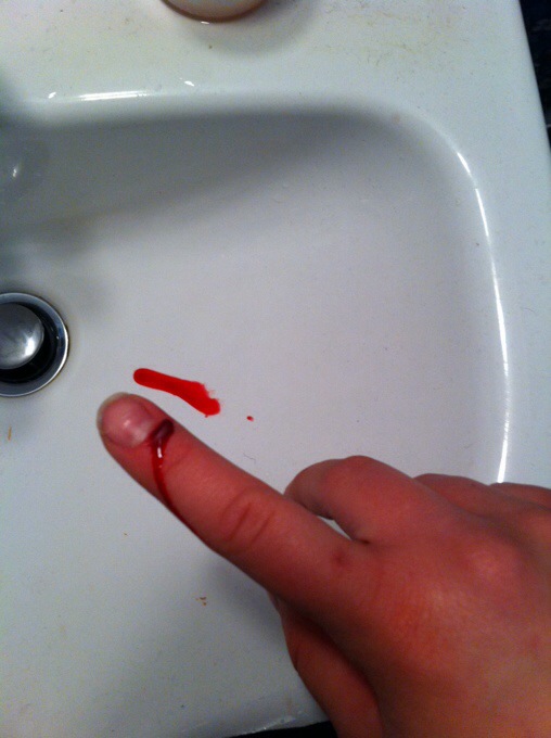 Precis innan jag ska gå så lyckas jag med att cutta upp mitt finger… suck. Dessutom så blev jag så chockad att det blödde så mycket så droppade blod på min vita jacka, f*n. Och det är dumt att ha ett köttsår när man ska ha praktik hela dagen. Plåster på- check.