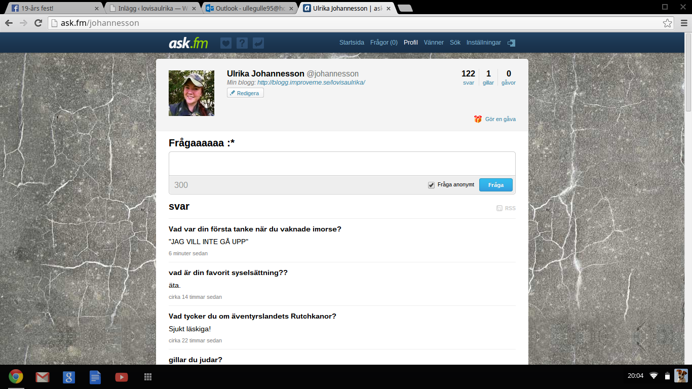 Jag räknar som sagt matte just nu vilket inte är överdrivet roligt. Så om någon vänlig själ känner för att underhålla mig lite grand (och störa mig från matten haha) så kan ni ställa frågor på min ask 😀 Svarar på allt utom min lillasyrras störda frågor 😉 Jag blir glad för alla frågor om det så är vad jag åt till frukost i fredags eller vad jag har för strumpor på mig idag, så fråga på! 😀