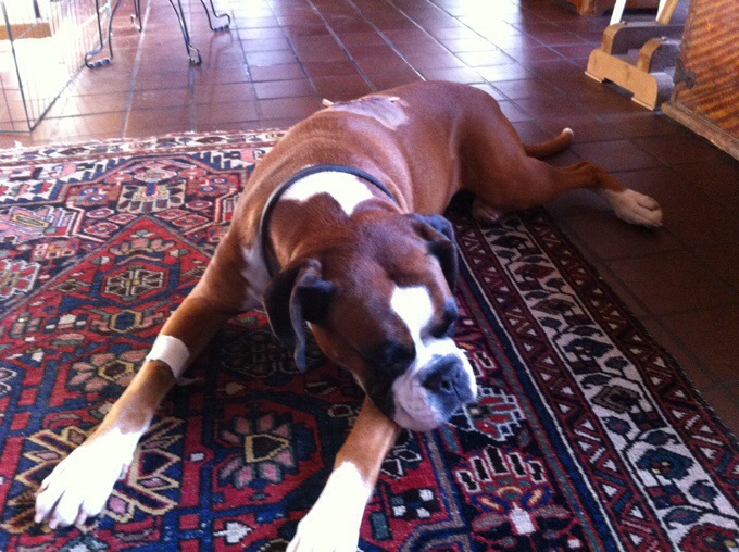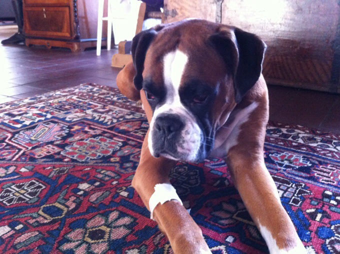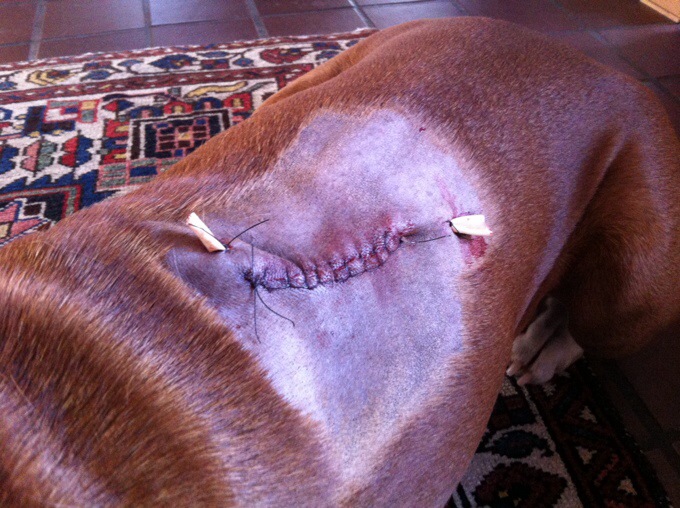 Slutade tidigare från praktiken så att jag kunde följa med till veterinären och hämta Tindra. Det var en glad men lite groggy vovve som kom fram och hälsade på oss. Hon har lite svårt att gå rakt och att stå utan att trilla (sjukt gulligt) men hon är förhållandevis pigg. Denna gången har de i princip grävt ut en grop i ryggen för att få bort området där tumören suttit. Så nu håller vi tummarna att detta var hennes sista operation! Det ”vita” som sitter i såret fungerar som en kanal för vätska som annars kan samlas i ”gropen” men en ska tas bort om några dagar. Huden där pälsen är bortrakad känns jätterolig haha.
