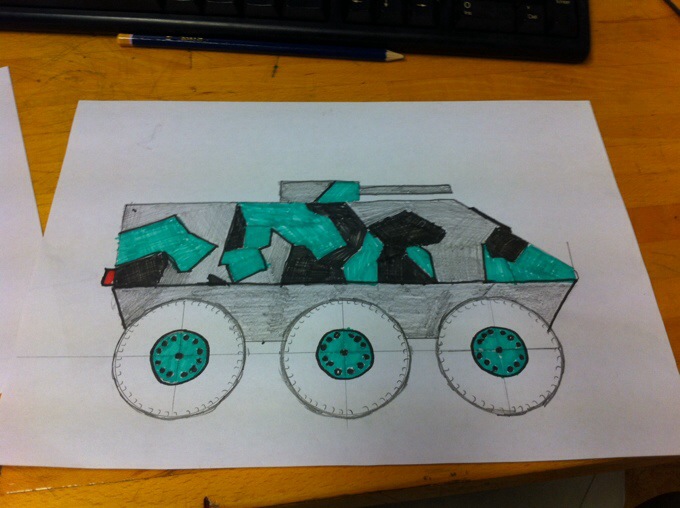 Vårat projektarbete i skolan skulle bli att bygga en stridsvagn men det är tyvärr dyrt och svårt att få tag i ett par band. 🙁 Jag är besviken men vi ger inte upp utan vi fortsätter militärtemat med att ta inspiration från en pansarterrängbil istället. Här är en skiss som Markus ritat och en bild på en riktig, vi får hoppas att detta blir bra.