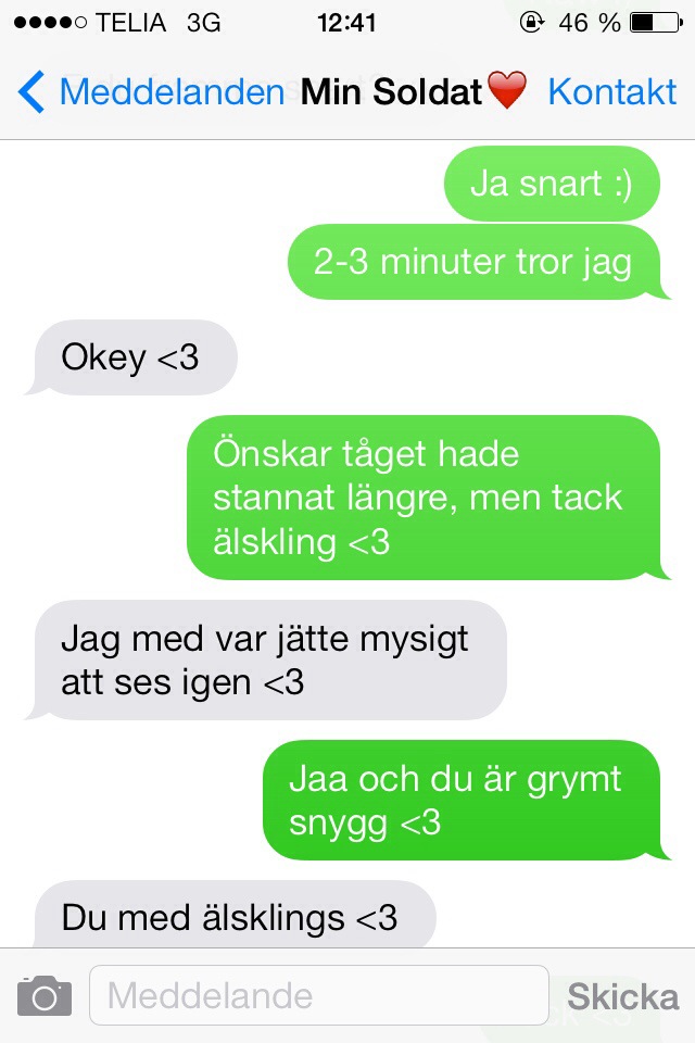 Jag sitter på tåget mot Göteborg nu och har nyss kört förbi Varberg. Jag smsade Simon om vilken tid mitt tåg skulle köra förbi så han kom och mötte mig vid tåget. Några sekunder fick vi innan jag var tvungen att gå på tåget igen men de sekunderna var guld värda. <3