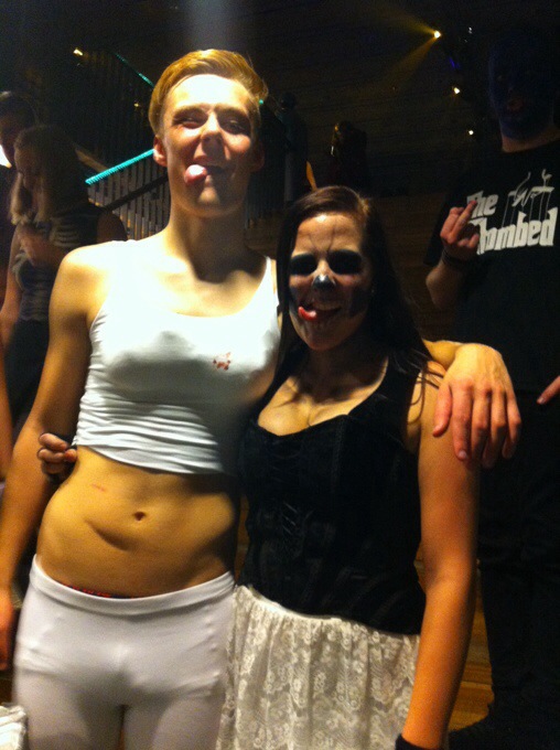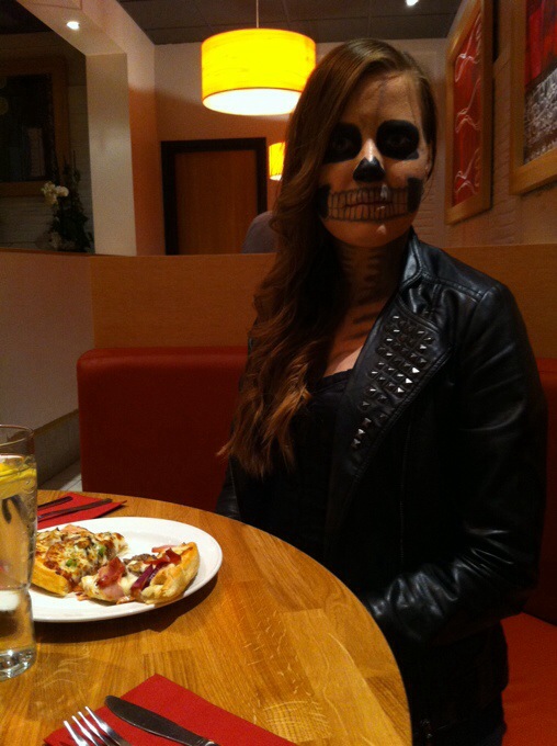 Efter vi sminkat oss tog vi spårvagnen till nordstan och gick o åt middag på Pizzahut. Fett goda pizzor har de haha (a). Det var riktigt kul att gå genom när vi var utklädda för många kollade och vi fick en del kommentarer haha. 😉 Sen tog vi bussen till Chalmers och halloweenfesten. Sjukt stor fest var det, massor av olika rum och dansgolv överallt, man kunde nog gå vilse där inne haha. Och nästan alla var utklädda, vi mötte bl.a. jedi riddare, jokern, en drake, pumpor, zombies och en massa andra galna utstyrslar. Det var kul att bara sitta ner och kolla på hur folk såg ut. 😀